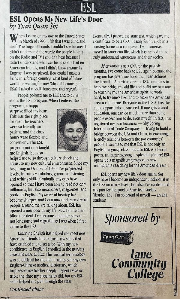 我仍旧花大部分时间读书,每周工作十来个小时维持简朴的生活。我觉得刚到美国时自己简直是瞎子聋子,看不明白,听不清楚。渐渐地,我变得心明眼亮了,我能听懂美国总统的竞选演说,还参加了当地的新移民英语作文比赛获得第一名,我的文章和照片登上了当地报纸,我享受到了知识的快乐!