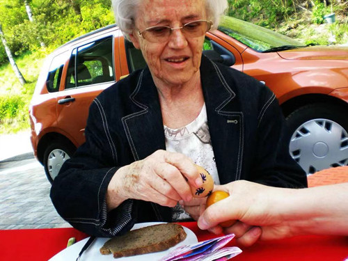 正餐开始之前,大家兴高采烈地互击彩蛋,谁的彩蛋破了,谁就输了,这也是当地的一种习俗。很快,西尔维娅精心绘制的彩蛋被撞得皮开肉绽,人们用餐刀把蛋切开,撒些盐和胡椒,又把黄油和带着厚厚一层白猪油的凝冻了的肉汁抹在黑面包上,吃得津津有味。