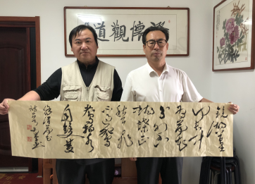 田有军字半农,因为他生在北京的农村,但并不种地而是在书法殿堂驰骋耕耘,故曰“半农”。有军师从书法大家易海云先生和刘俊京先生,记得初相识时,我曾做诗给他,《咏半农轩主人田有军》诗曰:“生在京城永丰屯,半农轩里自耕耘。狼毫为锄清心草,宣纸做田种辛勤。酒兴狂发字能舞,音乐奏起文有魂。满村点赞缘何故,德艺双馨福报人”,我与田有军之交, 是那种“君子之交淡如水”的交往,只谈理想,谈人生,谈艺术,没有任何铜臭打扰,加上美酒助兴,故感身心俱爽乃至极乐也。