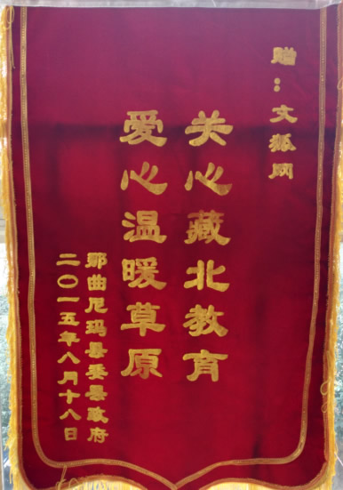 2014年4月21日,《文狐网》发布了捐赠西藏那曲地区小学生“爱心书屋”课外读物与文具倡仪书后,来自湖南、湖北,甘肃、河南等地的作家及社团积极响应,两个多月时间便捐出儿童读物三千多册,由北京新华社高级记者唐召明先生负责从北京运往了西藏那曲。2015年8月,那曲尼玛县委县政府为《文狐网》制作了一面锦旗。希望在不久的将来,网站能为藏区儿童做一些更加务实与力所能及的事。在此,我们特别要感谢参与捐赠的湖南女诗人杨亚杰老师,甘肃平川新青年文学社作家和发起人魁俊梅女士,河南作家艾平先生、秦汉书院李雨芳女士、雨薇公益基金创始人赵雨薇女士以及许多不知名的作家和朋友。另外要特别感谢的是,为武汉和平川两地免费运送赠品抵达北京的韵达快递田总、周总。