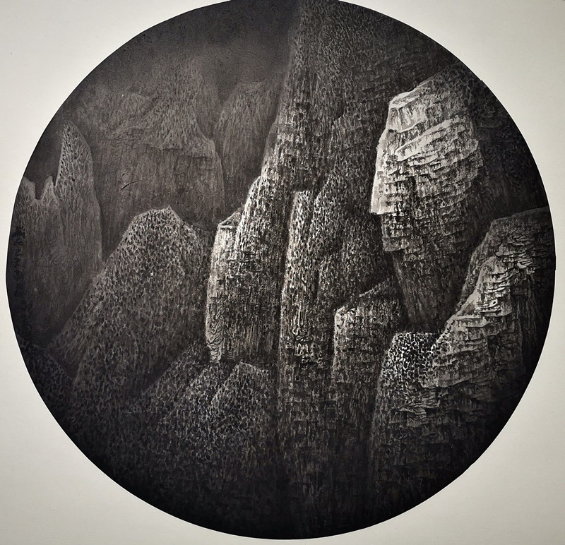 “大漠孤烟直,长河落日圆”,喜欢纪小虎画作中的那种悬崖峭壁、山峦云烟的缥缈虚空;喜欢那种置身山水涧峡森松隐逸的仙风遗韵;喜欢他在笔墨中把“浮光随日度”里“峻塬清华”间的密密麻麻、皴染互生挥洒得酣畅肆意。