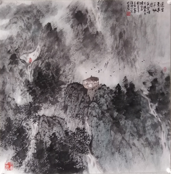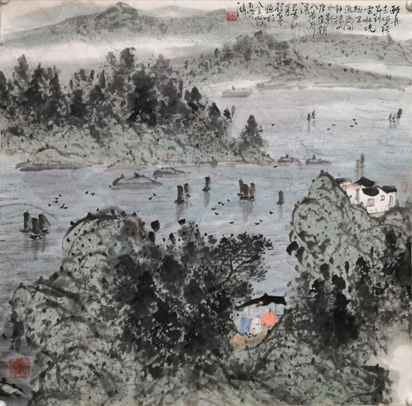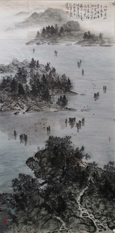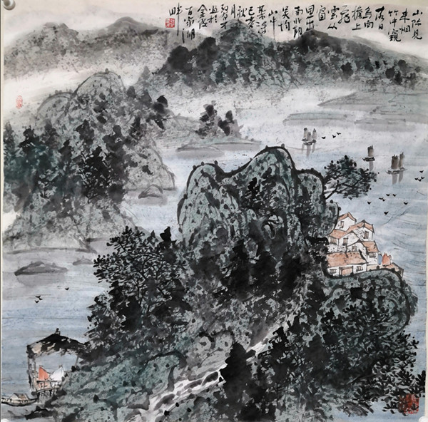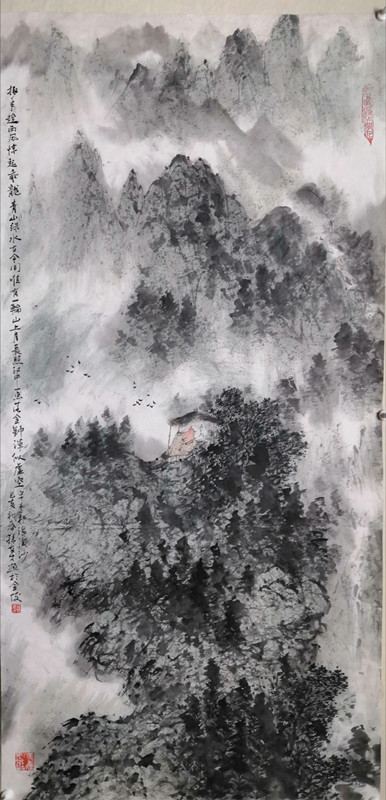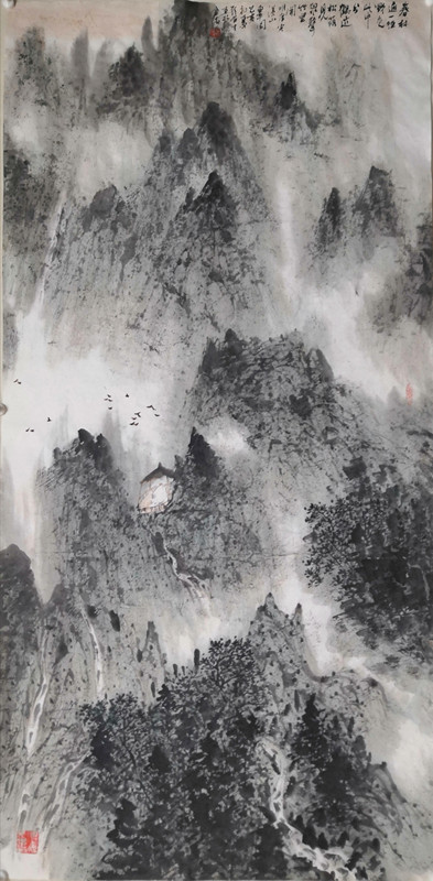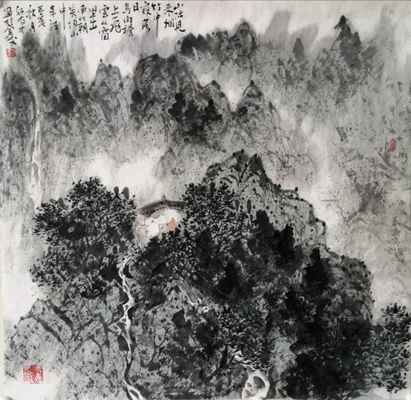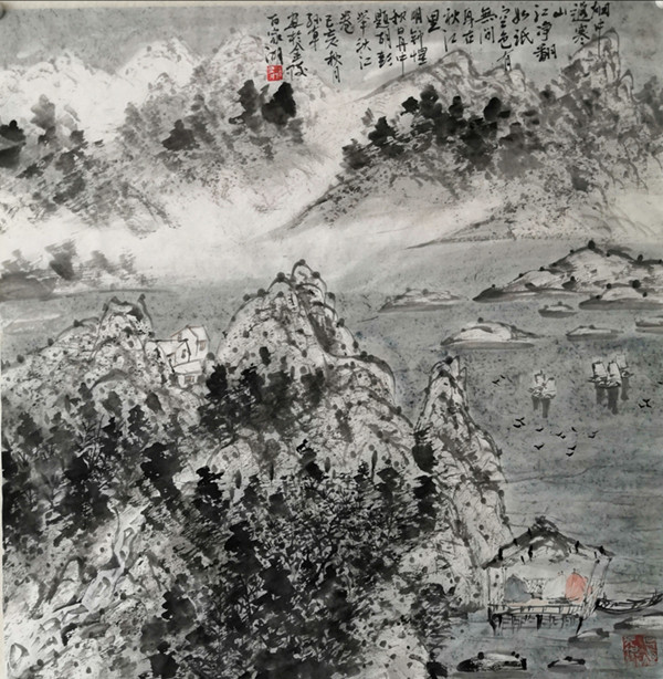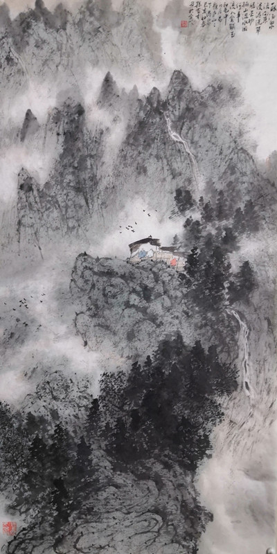 ► 注重将个体心境表达与传统意境表达结合起来。在将表现主题纳入意识进行构思时,他会根据自然山水不同的形貌特征来描绘,表现出物象那天然造就的风骨、姿态。把自然山水的内在精神蕴涵于笔墨、线条中。在墨色的对比中,他凭着对空间关系的把握塑造意象化的审美体系,并将山水之美与画面之美进行艺术语言的融合与概括,使作品呈现出一种清逸旷远、寥廓无边的传统意境。
