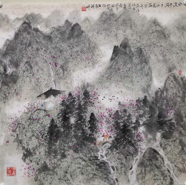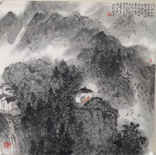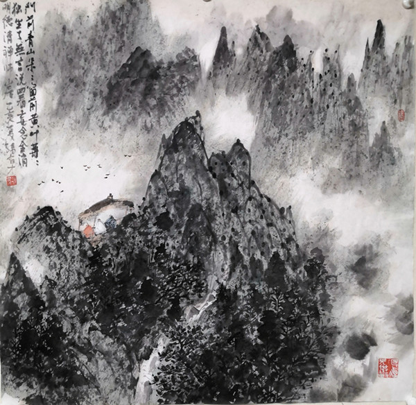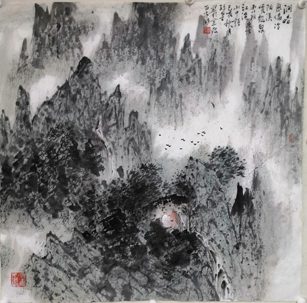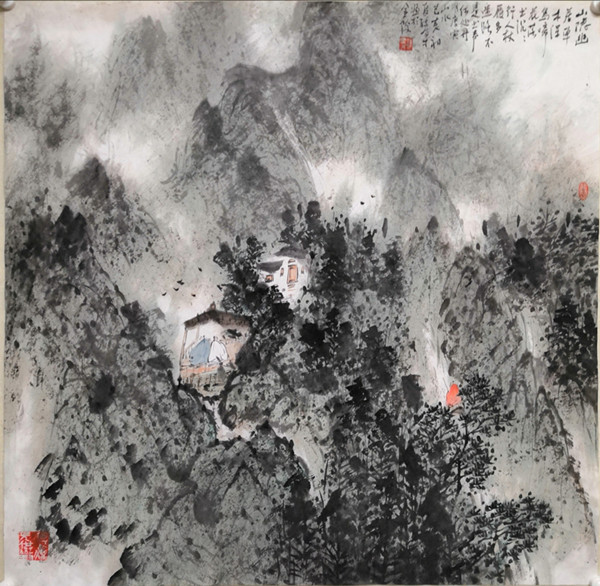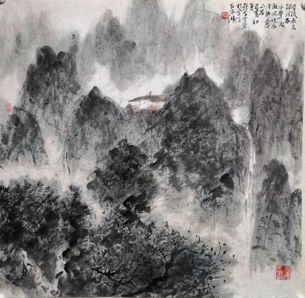 ►在创作中,孙有才注重根据描绘山水时的心理感受,表现画面的动势化倾向;注重依据山水的向背进行书写的变化与浓淡关系的表现,用墨用水之灵动实而不滞。他在墨色的变化中统筹“形”的塑造与“意”的的通达,以写意的笔触与情感达到契合;在畅神遨游中,把握山水生命的勃然生机,表现出线、面相互交织的生命律动。另外,他还会根据山体的不同变化来用线,线条抑扬顿挫,富有节奏感。他以气势性的书写和运势连贯的运笔,表现出了激荡连绵、深沉幽远的山水景象,令人神往。
